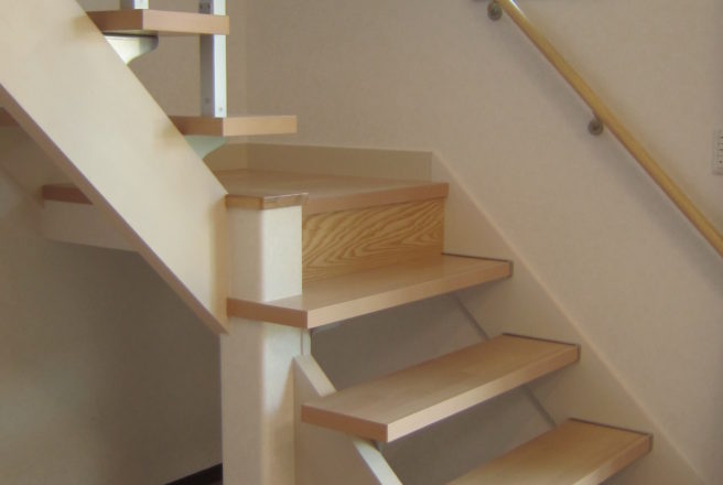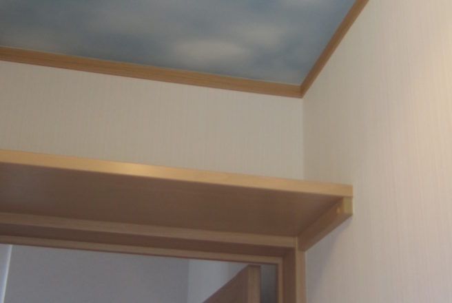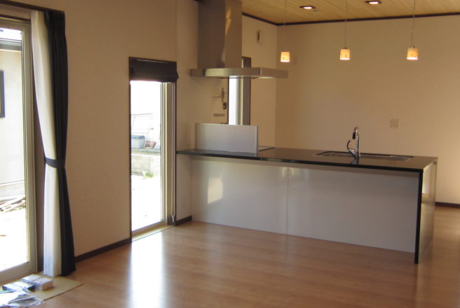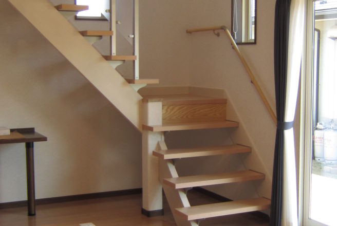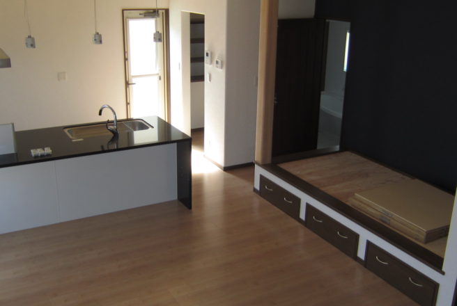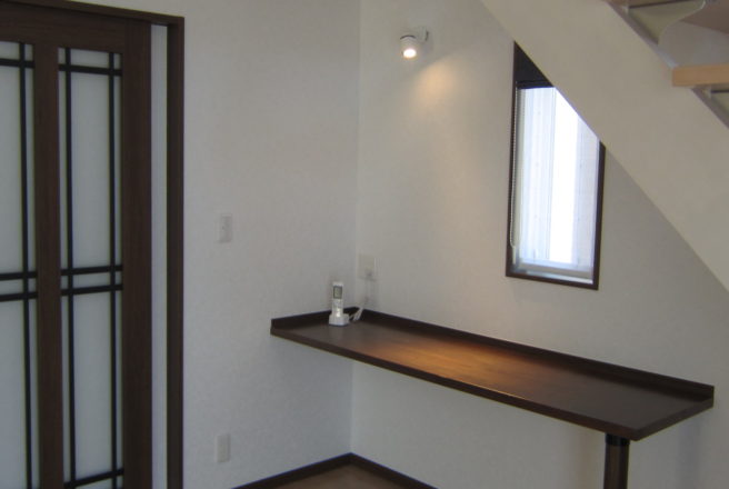 若い世帯の家族でいろいろな展示場を見てそこからO様が良いと思った事を内装・外装に取り入れました。廊下の壁に小物を置ける棚やリビングダイニングから2階へ行くことができる階段、すぐ脇には畳を置くスペースも設置しております。また、トイレの天井に青空の壁紙を貼るなど小さいお子様が喜ばれるような工夫をしています。