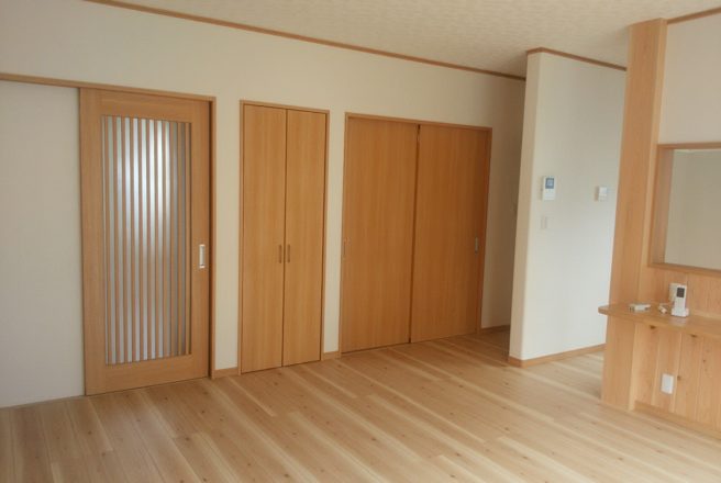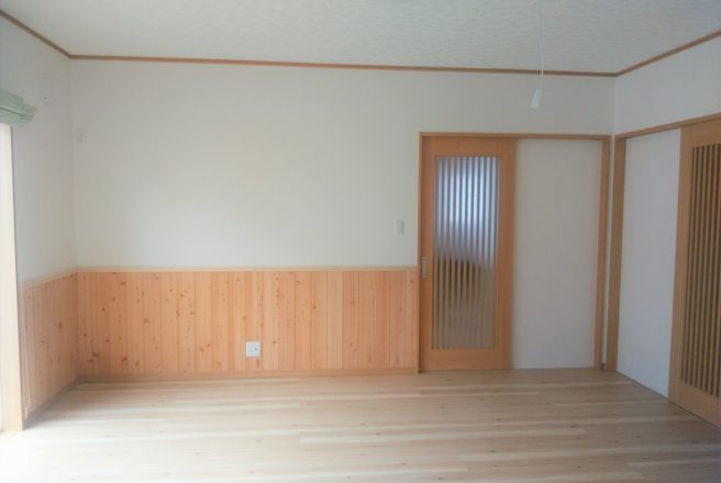 木のぬくもりが感じられるように、リビングや玄関ホール、廊下の壁などの下部にはクロスではなく、無垢材の腰板を使用しています。フローリングもナチュラル系で、家全体が癒しと優しさのある仕上がりになりました。